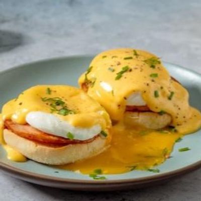 Two Eggs served on an English Muffin w/Bacon and Hollandaise