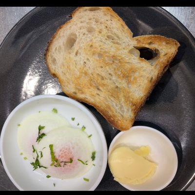 whole meal toast buttered, soft poached eggs separate bowl, side of chutney